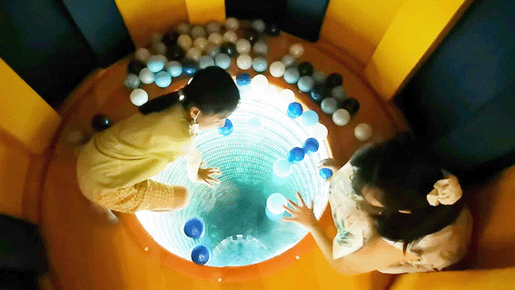(歡樂海洋球)人人偏愛的顏色各有不同,但幾乎沒有人會拒絕藍色,此次采用藍色為主基調,以其他色系進行搭配點綴。藍色,非常純凈,通常讓人聯想到海洋、天空、水、宇宙。作為自然界最為常見的色彩,藍色表現出一種冷靜、安詳與廣闊,具有讓人安靜的力量。放眼望去仿佛是一片藍色的海洋,小朋友們在球池翻騰跳躍,仿佛掀起的一片片的波浪,其實這是為太空花園創造生機的“蓄能池”。#能量源泉 #