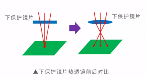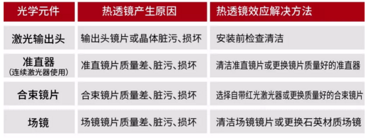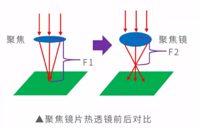 由于光學元件質量差、臟污、損壞等原因造成對激光吸收率增大,光學元件受激光束連續較長時間照射后,溫度升高產生熱變形,進而引起透過型光學元件的折射率和反射型光學元件的反射方向發生變化。熱透鏡效應會改變激光焦點(束腰)的位置,進而影響應用效果。